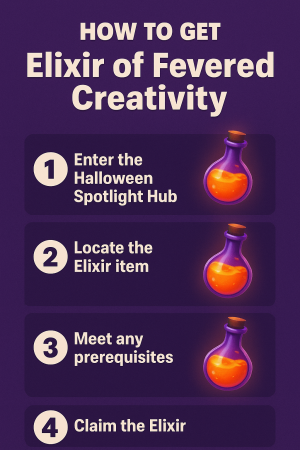 - The “Elixir of Fevered Creativity” is a UGC (User Generated Content) launcher item — effectively a cosmetic accessory (launcher-style item) players can obtain during the event. [1]