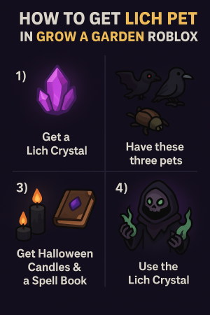 The Lich Pet is one of the rarest and most powerful companions in Grow a Garden, introduced during the Halloween (Ghoul Garden) event. Known for its eerie design and divine-tier abilities, the Lich Pet is the result of a special fusion ritual that combines three spooky pets — the Bat, Crow, and Scarab — along with exclusive event items like Halloween Candles and a Spell Book. Players must also use the mysterious Lich Crystal, a limited Halloween item, to awaken this undead guardian. Once obtained, the Lich Pet grants exceptional boosts to spooky plants and event farming, making it a highly sought-after addition for collectors and advanced gardeners alike.